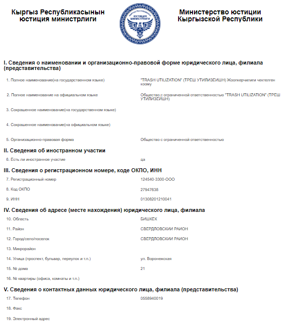 ОсОО TRASH UTILIZATION («ТРЕШ УТИЛИЗЕЙШН») учредили в августе 2012-го Касым Курбанов и Митев Росен Митков. Компания официально занимается обработкой и уничтожением безопасных отходов. Из налоговых отчислений за организацией числится только платеж в 292 сома в апреле 2015 года за дубликат свидетельства. Касым Курбанов числится в ней руководителем.
