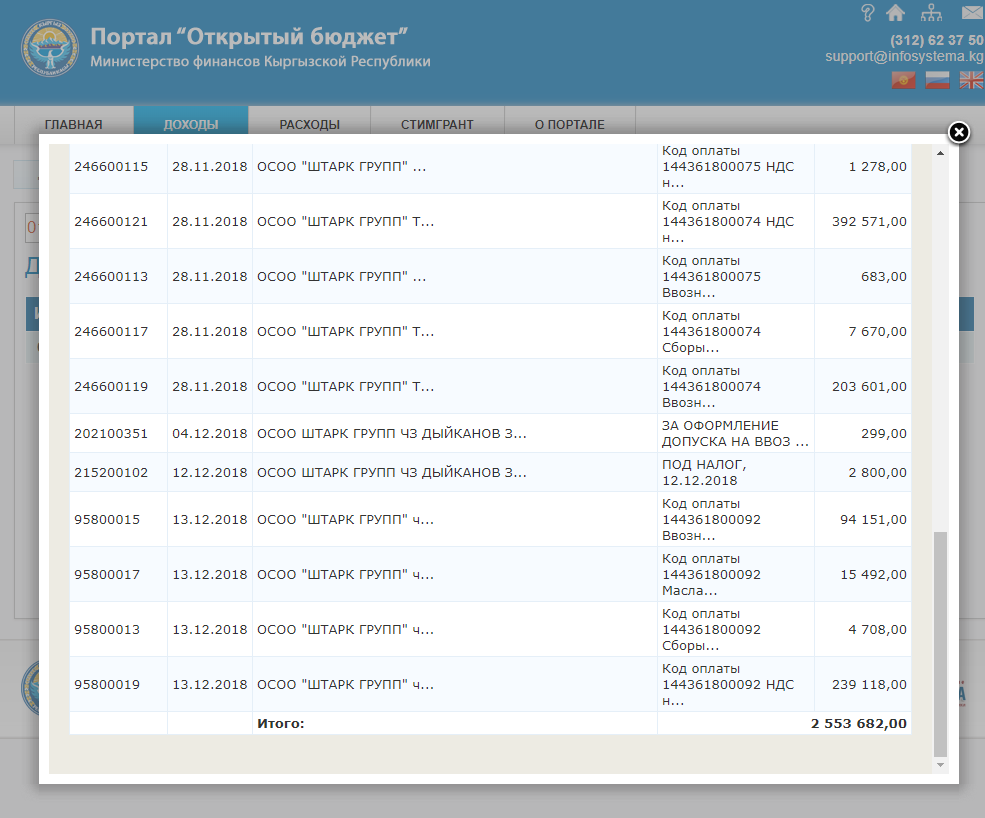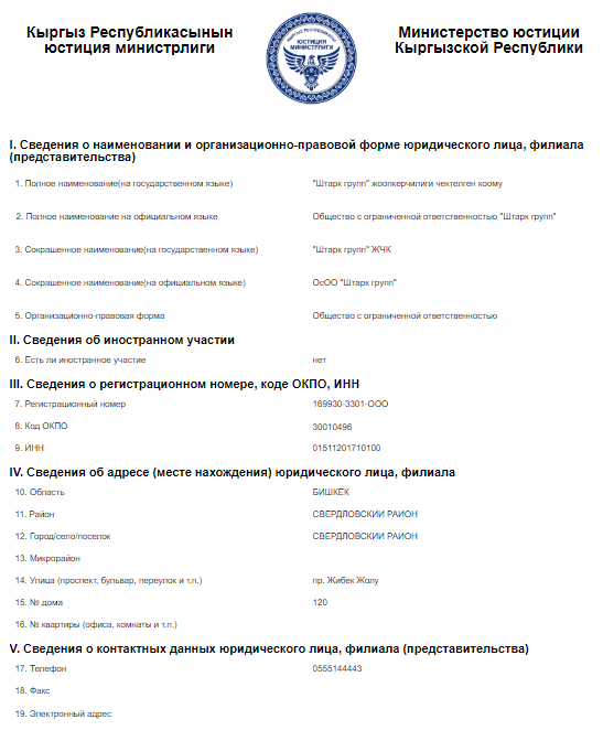 ОсОО «Штарк Групп» занимается оптовой неспециализированной торговлей и зарегистрировано в ноябре 2017 года. Учредителем и руководителем является Касым Курбанов. Налоги и платежи фирма платит исправно. За два года она перечислила в бюджет 2,5 миллиона сомов.