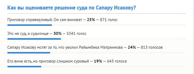 Так, 30 процентов респондентов отметили, что происходившее — это не суд, а судилище. Еще 24 процента читателей уверены, что Сапару Исакову мстят за увольнение Райымбека Матраимова. 25 процентов читателей наоборот полагают, что приговор вполне справедливый и бывший премьер его заслужил. А 19 процентов считают, что вина Сапара Исакова в деле о модернизации ТЭЦ действительно есть, но суд был слишком суров.