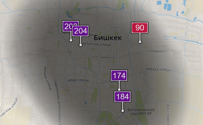 • в районе улиц Бейшеналиевой/Токтогула. Уровень загрязнения превышен в 5,17 раза: PM2.5 среднесуточный — 181 мкг/м³, на момент измерения — 203 мкг/м³;