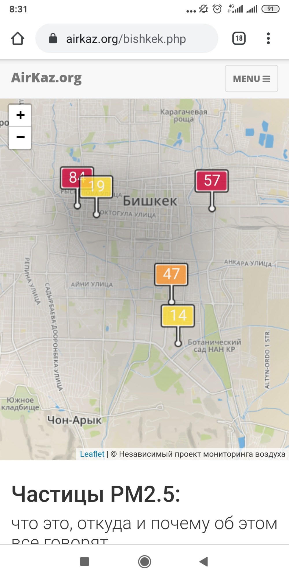 - в районе улиц Бейшеналиевой/Токтогула. Уровень загрязнения превышен в 3,22 раза: PM2.5 среднесуточный — 113 мкг/м³, на момент измерения — 84 мкг/м³;