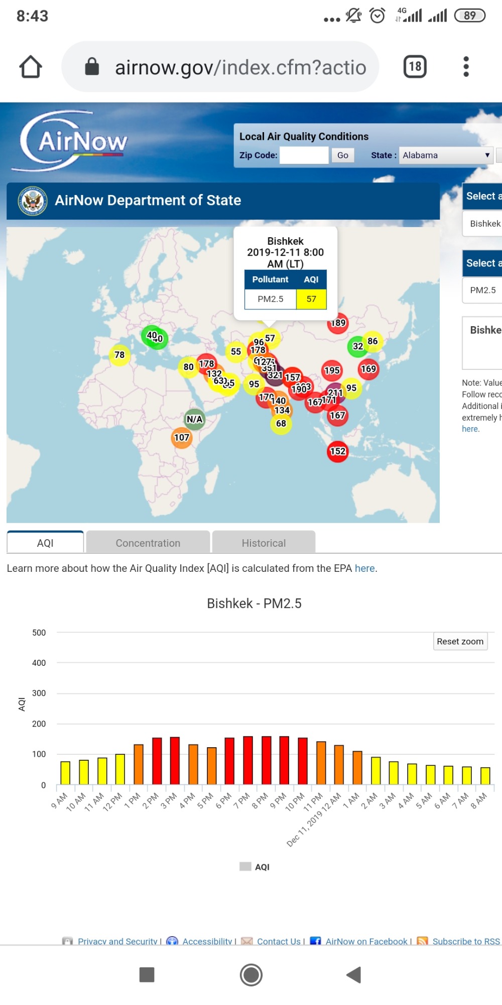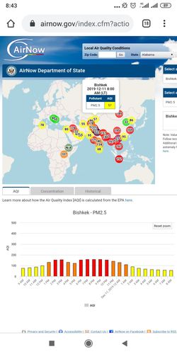 Посольство США в Кыргызстане также установило датчик. Он показывает индекс качества воздуха в режиме онлайн. Информация обновляется ежечасно.