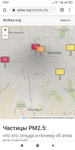 - жилмассив «Ак-Орго». Уровень загрязнения превышен в 6,25 раза: PM2.5 среднесуточный — 219 мкг/м³, на момент измерения — 68 мкг/м³;