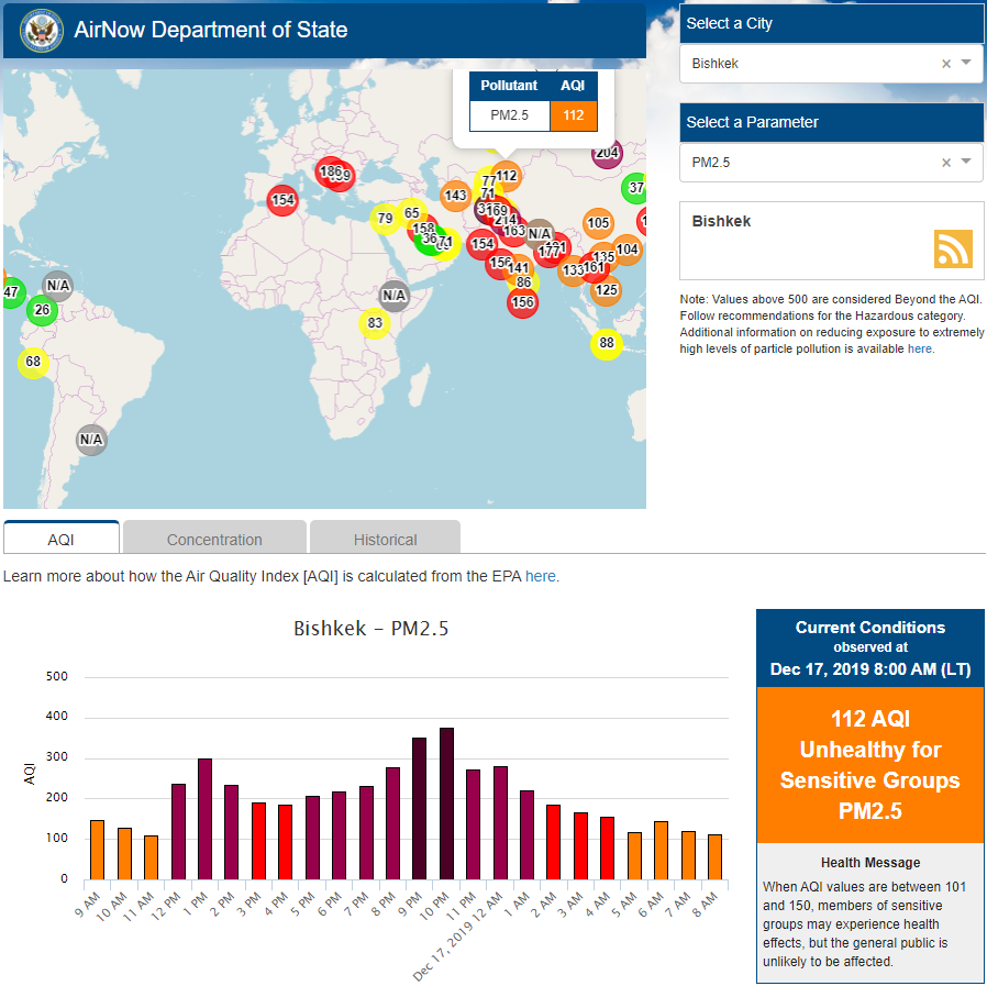 Посольство США в Кыргызстане также установило датчик. Он показывает индекс качества воздуха в режиме онлайн. Информация обновляется ежечасно. Отметим, монитор качества воздуха дипмиссии зарегистрирован Кыргызстандартом.
