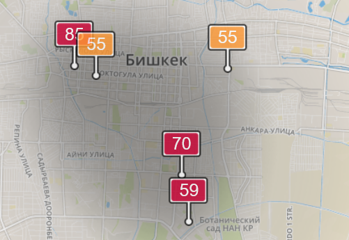 - в районе улиц Бейшеналиевой/Токтогула. Уровень загрязнения превышен в 2,14 раза: PM2.5 среднесуточный — 75 мкг/м³, на момент измерения — 85 мкг/м³;
