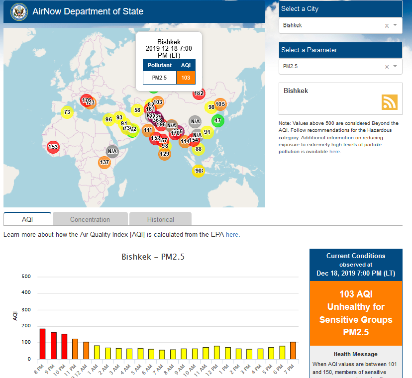Посольство США в Кыргызстане также установило датчик. Он показывает индекс качества воздуха в режиме онлайн. Информация обновляется ежечасно.