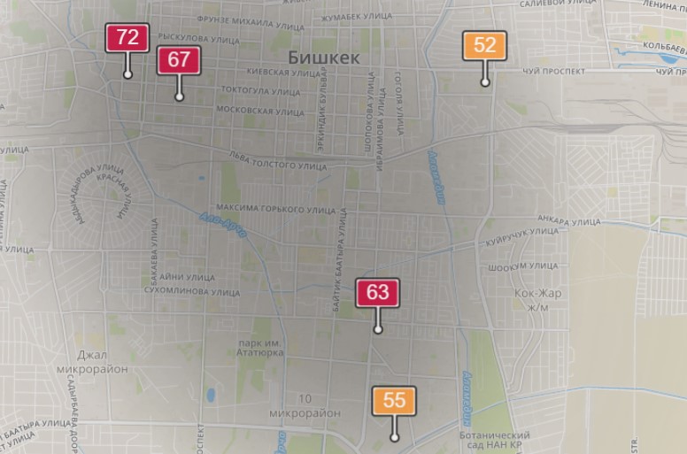 - в районе улиц Бейшеналиевой/Токтогула. Уровень загрязнения превышен в 1,91 раза: PM2.5 среднесуточный — 67 мкг/м³, на момент измерения — 72 мкг/м³;