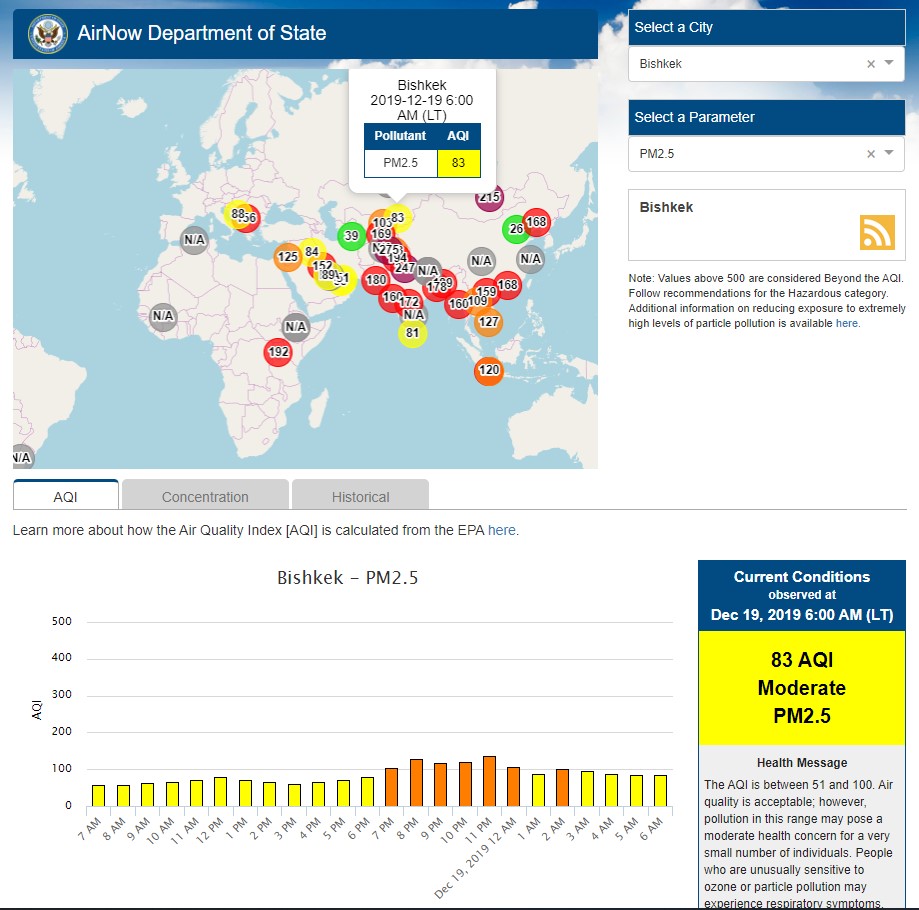 Посольство США в Кыргызстане также установило датчик. Он показывает индекс качества воздуха в режиме онлайн. Информация обновляется ежечасно.