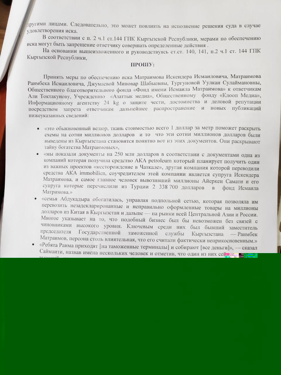 В иске приводится несколько фраз, которые, по мнению семьи Матраимовых, порочат их честь, достоинство и деловую репутацию. К примеру: «это обыкновенный велюр, ткань стоимостью всего 1 доллар за метр поможет раскрыть схемы на сотни миллионов долларов и то, что сотни миллионов долларов были выведены из Кыргызстана становится понятным вот из этих документов. Они раскрывают тайну богатства Матраимовых».