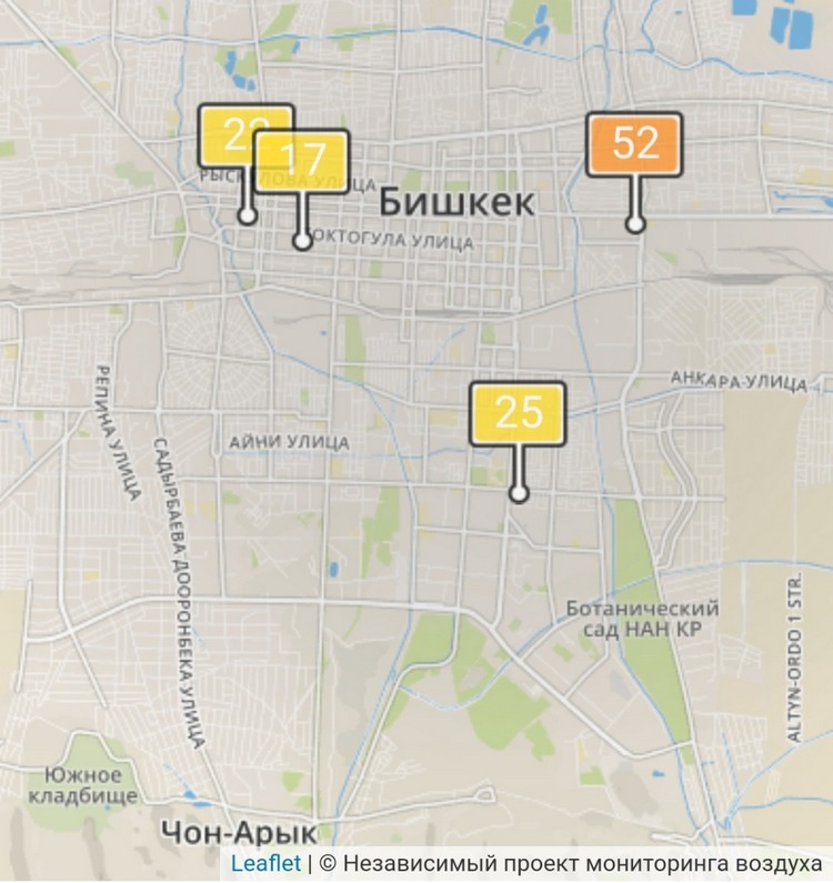 - в районе улиц Бейшеналиевой/Токтогула. Уровень загрязнения превышен в 2,4 раза: PM2.5 среднесуточный — 84 мкг/м³, на момент измерения — 22 мкг/м³;