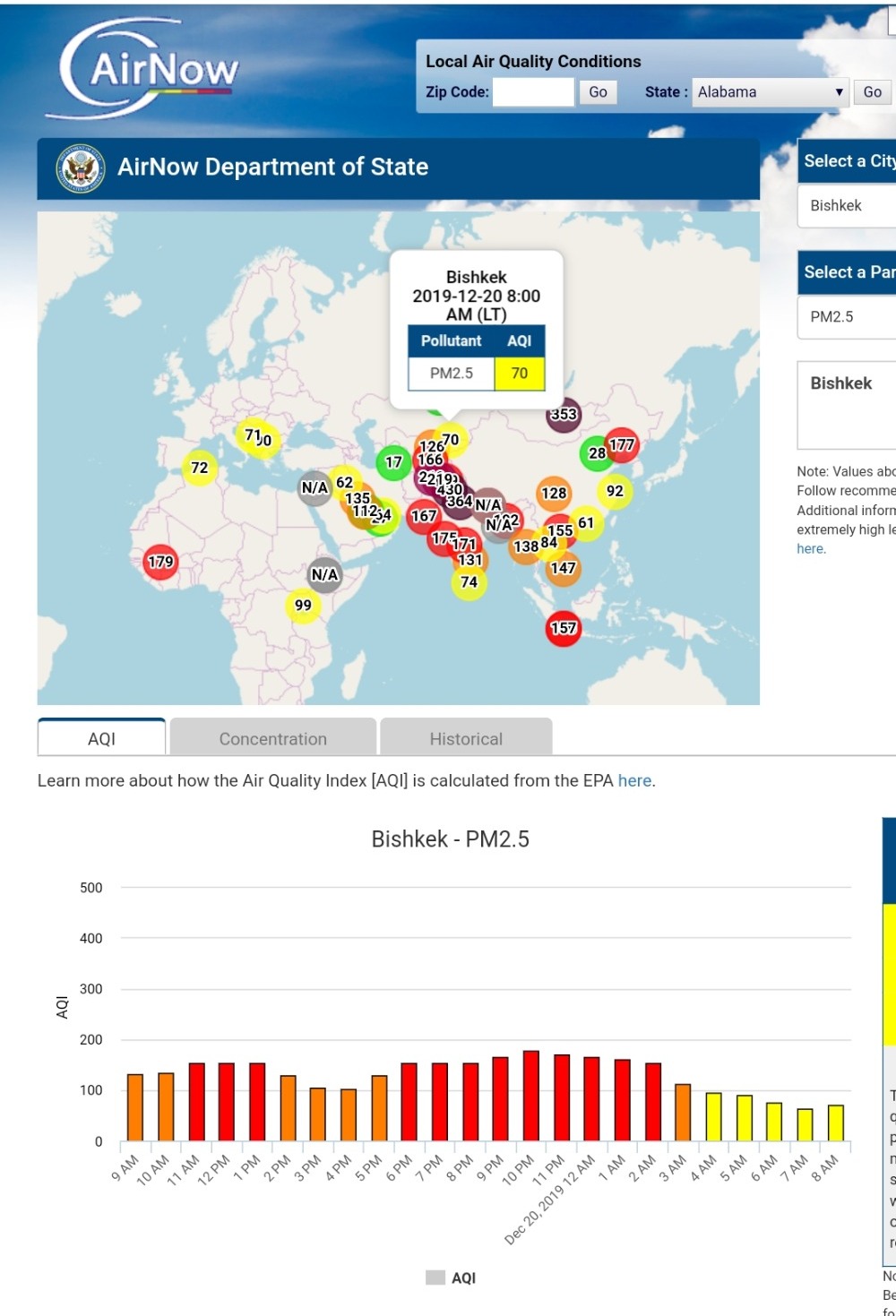 Посольство США в Кыргызстане также установило датчик. Он показывает индекс качества воздуха в режиме онлайн.