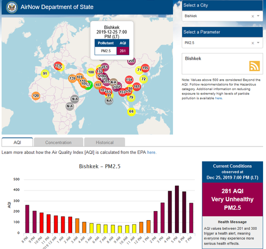 Посольство США в Кыргызстане также установило датчик. Он показывает индекс качества воздуха в режиме онлайн. Информация обновляется ежечасно.