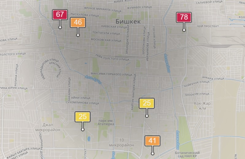 - в районе улиц Бейшеналиевой/Токтогула. Уровень загрязнения превышен в 2,74 раза: PM2.5 среднесуточный — 96 мкг/м³, на момент измерения — 67 мкг/м³;