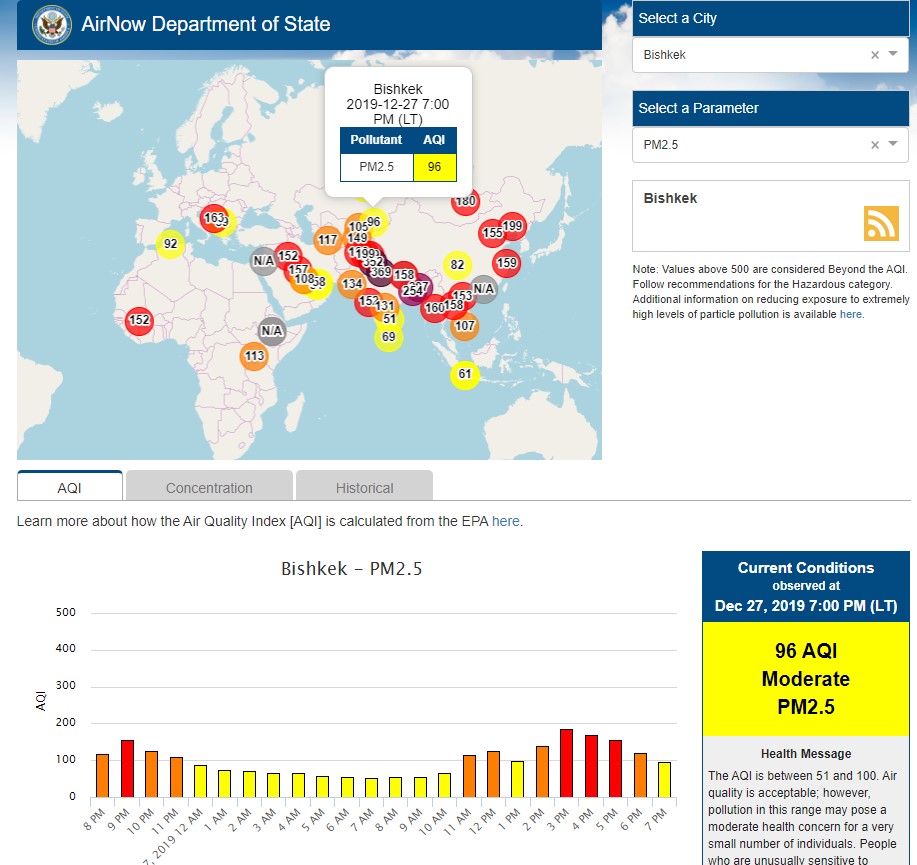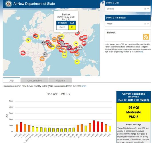 Посольство США в Кыргызстане также установило датчик. Он показывает индекс качества воздуха в режиме онлайн. Информация обновляется ежечасно.