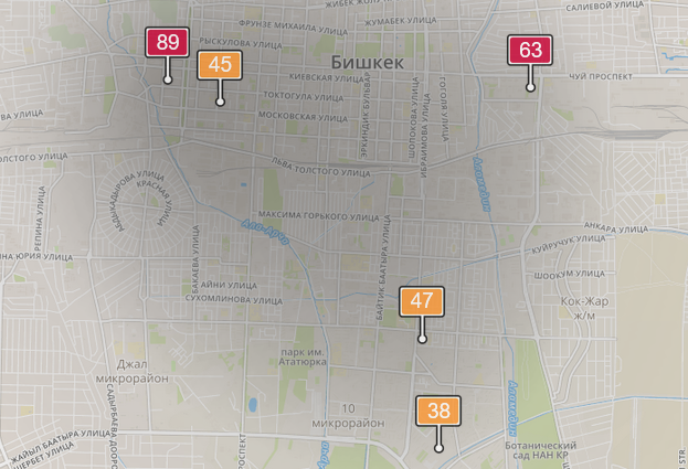 - в районе улиц Бейшеналиевой/Токтогула. Уровень загрязнения превышен в 2,34 раза: PM2.5 среднесуточный — 82 мкг/м³, на момент измерения — 89 мкг/м³;