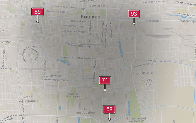 • в районе улиц Бейшеналиевой/Токтогула. Уровень загрязнения превышен в четыре раза: PM2.5 среднесуточный — 142 мкг/м³, на момент измерения — 85 мкг/м³;