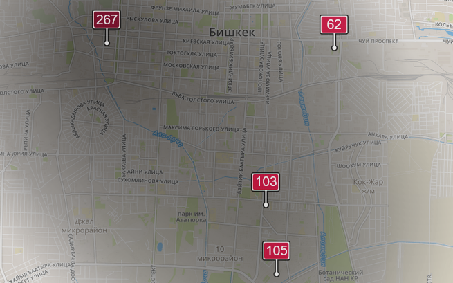 - в районе улиц Бейшеналиевой/Токтогула. Уровень загрязнения превышен в 4,11 раза: PM2.5 среднесуточный — 144 мкг/м³, на момент измерения — 267 мкг/м³;