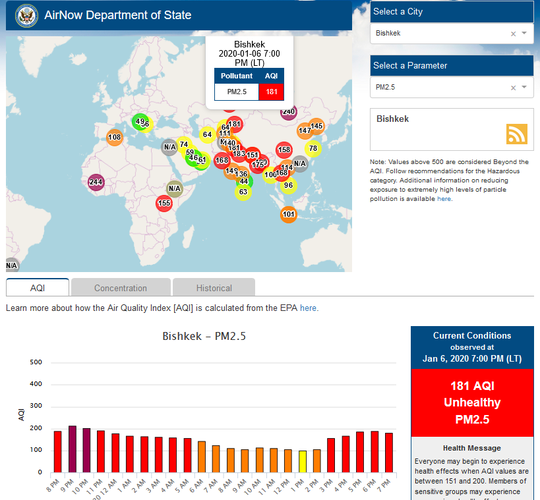 Посольство США в Кыргызстане также установило датчик. Он показывает индекс качества воздуха в режиме онлайн. Информация обновляется ежечасно.