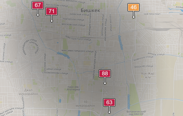 - в районе улиц Бейшеналиевой/Токтогула. Уровень загрязнения превышен в 1,97 раза: PM2.5 среднесуточный — 69 мкг/м³, на момент измерения — 67 мкг/м³;