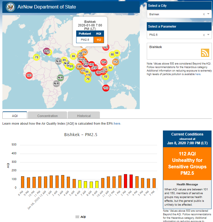 Посольство США в Кыргызстане также установило датчик. Он показывает индекс качества воздуха в режиме онлайн. Информация обновляется ежечасно.