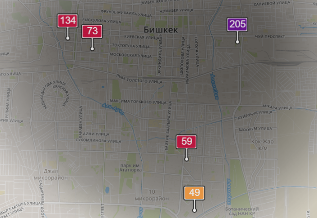 - в районе улиц Бейшеналиевой/Токтогула. Уровень загрязнения превышен в 3,5 раза: PM2.5 среднесуточный — 123 мкг/м³, на момент измерения — 134 мкг/м³;