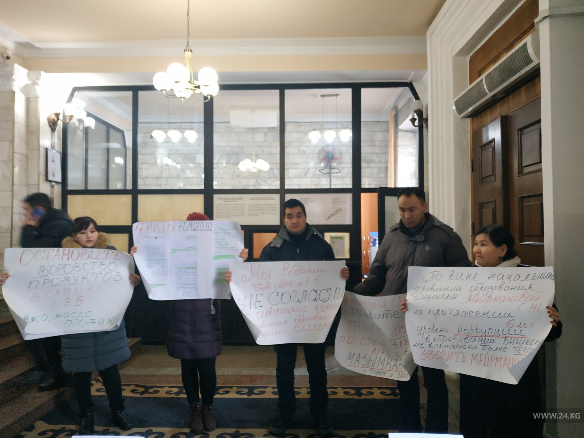 Родители воспитанников детского сада № 5 Первомайского района Бишкека вышли на митинг к зданию мэрии с требованием уволить заведующую дошкольной организацией Динару Мазымканову.