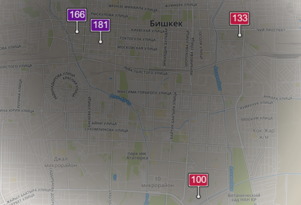 • в районе улиц Бейшеналиевой/Токтогула. Уровень загрязнения превышен в 2,85 раза: PM2.5 среднесуточный — 100 мкг/м³, на момент измерения — 166 мкг/м³;