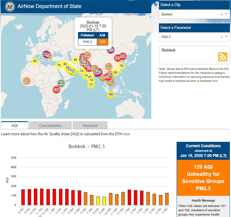 Посольство США в Кыргызстане также установило датчик. Он показывает индекс качества воздуха в режиме онлайн. Информация обновляется ежечасно.
