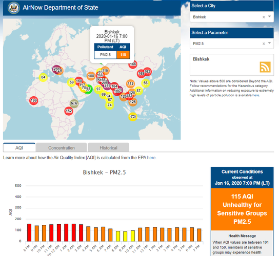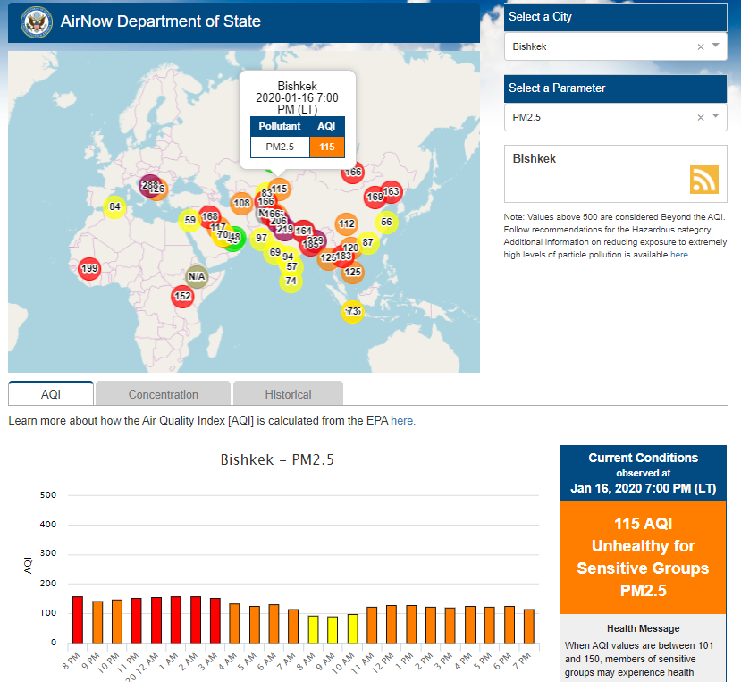 Посольство США в Кыргызстане также установило датчик. Он показывает индекс качества воздуха в режиме онлайн. Информация обновляется ежечасно.