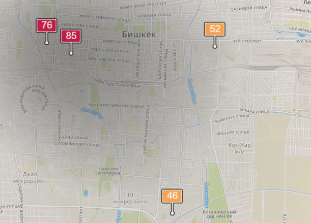• в районе улиц Бейшеналиевой/Токтогула. Уровень загрязнения превышен в 2,4 раза: PM2.5 среднесуточный — 84 мкг/м³, на момент измерения — 76 мкг/м³;
