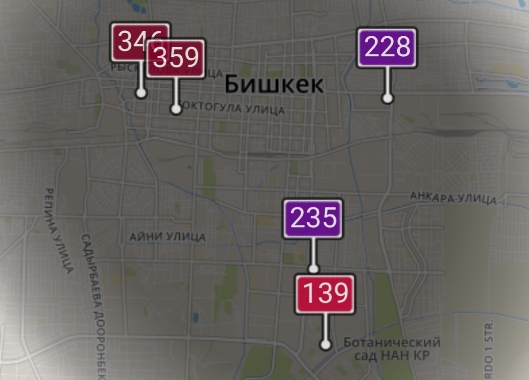 - в районе улиц Бейшеналиевой/Токтогула. Уровень загрязнения превышен в 3,34 раза: PM2.5 среднесуточный — 117 мкг/м³, на момент измерения — 346 мкг/м³;