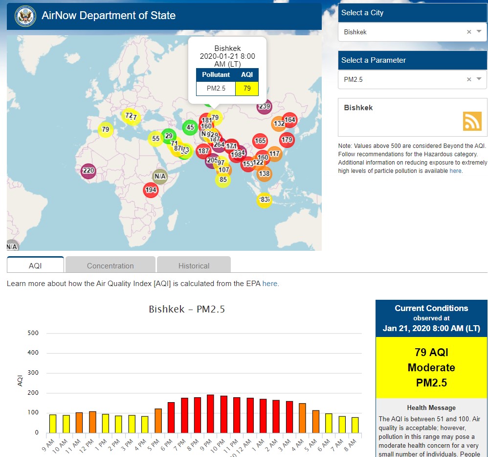 Посольство США в Кыргызстане также установило датчик. Он показывает индекс качества воздуха в режиме онлайн. Информация обновляется ежечасно.