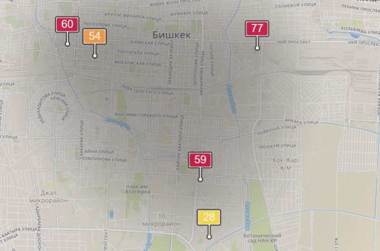 - в районе улиц Бейшеналиевой/Токтогула. Уровень загрязнения превышен в три раза: PM2.5 среднесуточный — 105 мкг/м³, на момент измерения — 60 мкг/м³;