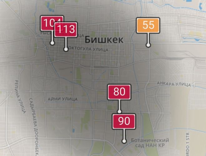 - в районе улиц Бейшеналиевой/Токтогула. Уровень загрязнения превышен в три раза: PM2.5 среднесуточный — 105 мкг/м³, на момент измерения — 104 мкг/м³;
