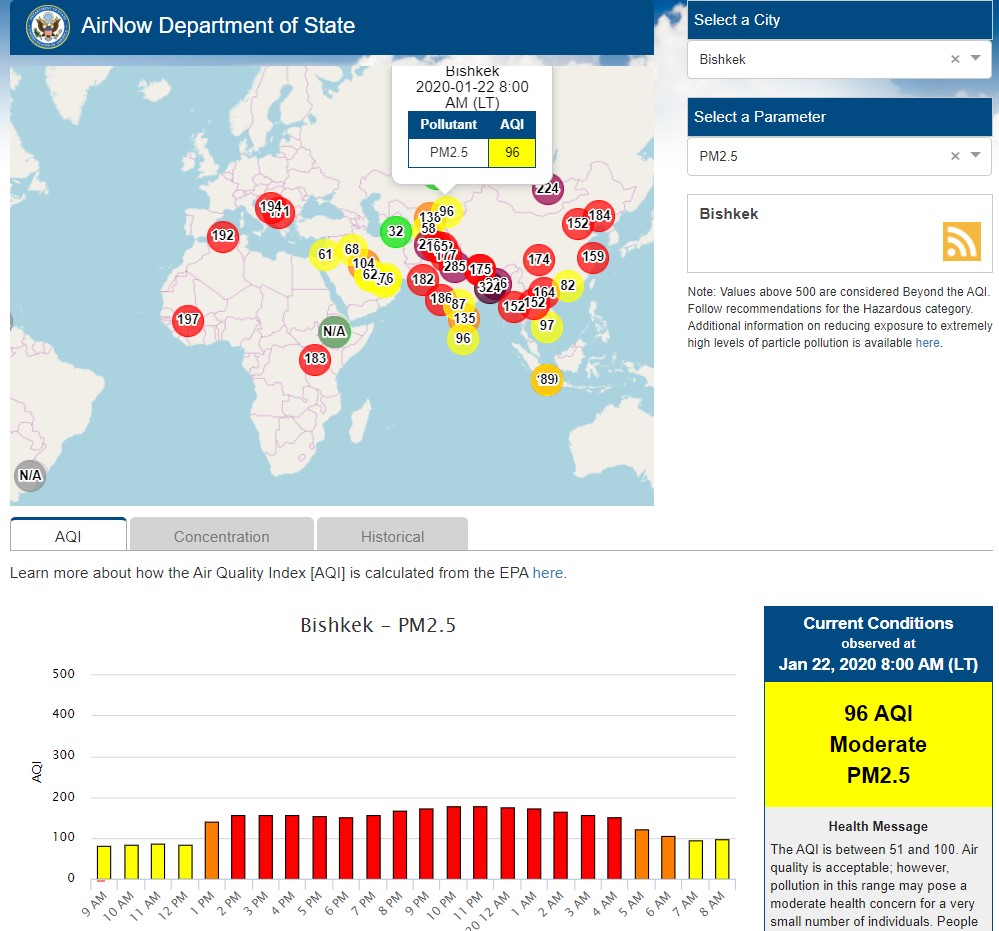 Посольство США в Кыргызстане также установило датчик. Он показывает индекс качества воздуха в режиме онлайн. Информация обновляется ежечасно.