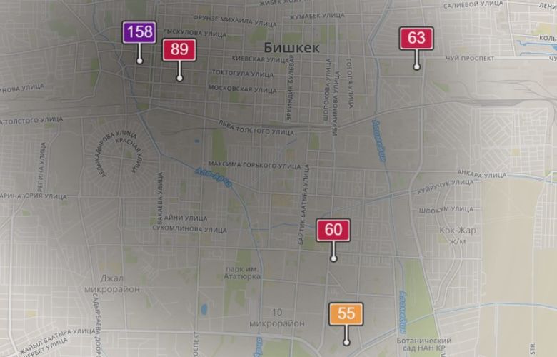 - в районе улиц Бейшеналиевой/Токтогула. Уровень загрязнения превышен в 3,28 раза: PM2.5 среднесуточный — 115 мкг/м³, на момент измерения — 158 мкг/м³;