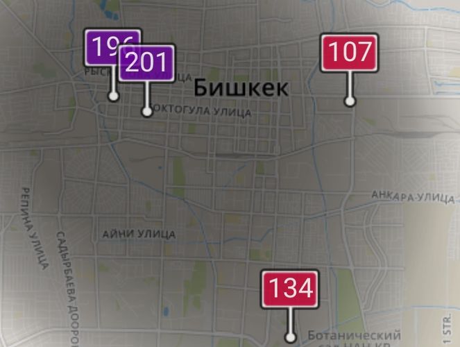 • в районе улиц Бейшеналиевой/Токтогула. Уровень загрязнения превышен в 4,34 раза: PM2.5 среднесуточный — 152 мкг/м³, на момент измерения — 196 мкг/м³;