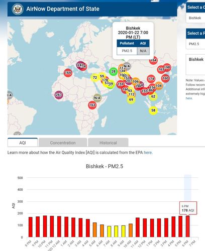 Посольство США в Кыргызстане также установило датчик. Он показывает индекс качества воздуха в режиме онлайн. Информация обновляется ежечасно.