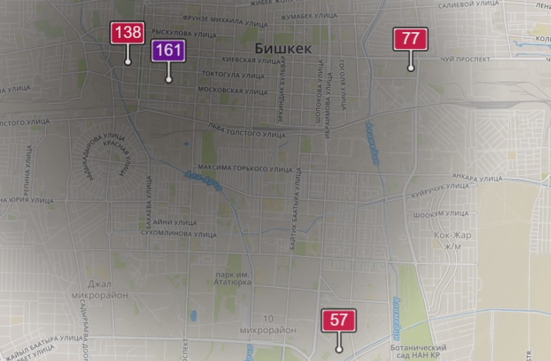 - в районе улиц Бейшеналиевой/Токтогула. Уровень загрязнения превышен в 5,42 раза: PM2.5 среднесуточный — 190 мкг/м³, на момент измерения — 138 мкг/м³;