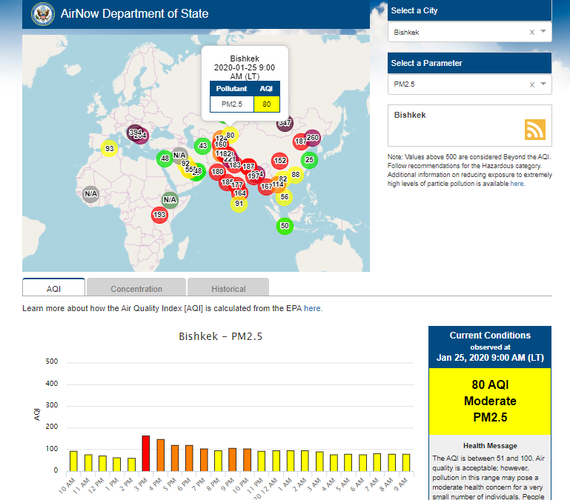 Посольство США в Кыргызстане также установило датчик. Он показывает индекс качества воздуха в режиме онлайн. Информация обновляется ежечасно.