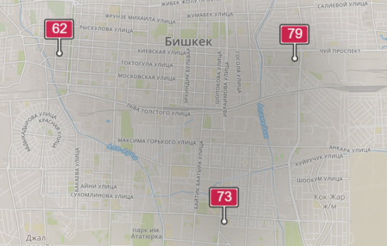 - в районе улиц Бейшеналиевой/Токтогула. Уровень загрязнения превышен в 2,51 раза: PM2.5 среднесуточный — 54 мкг/м³, на момент измерения — 62 мкг/м³;