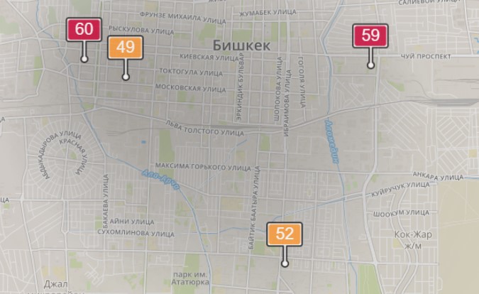 - в районе улиц Бейшеналиевой/Токтогула. Уровень загрязнения превышен в 1,74 раза: PM2.5 среднесуточный — 61 мкг/м³, на момент измерения — 60 мкг/м³;
