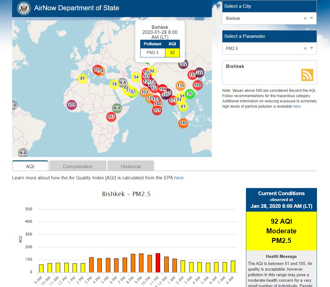 Посольство США в Кыргызстане также установило датчик. Он показывает индекс качества воздуха в режиме онлайн. Информация обновляется ежечасно.