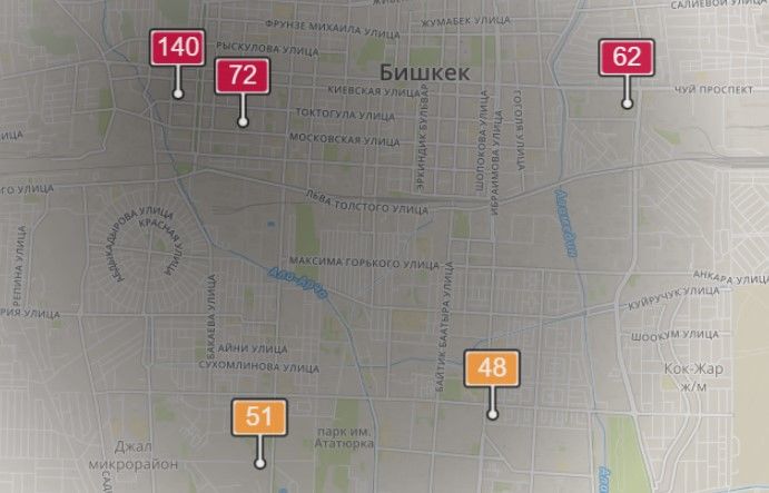 - в районе улиц Бейшеналиевой/Токтогула. Уровень загрязнения превышен в 3,08 раза: PM2.5 среднесуточный — 108 мкг/м³, на момент измерения — 140 мкг/м³;
