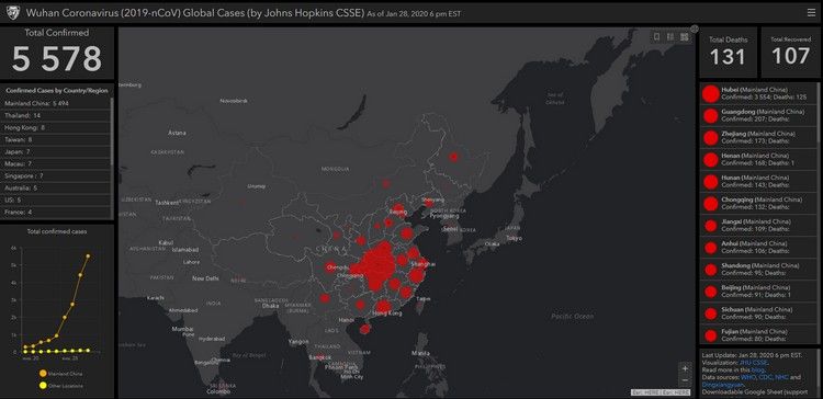 Число погибших от нового коронавируса в Китае выросло до 131 человека. Об этом свидетельствуют данные онлайн-карты, разработанной учеными.