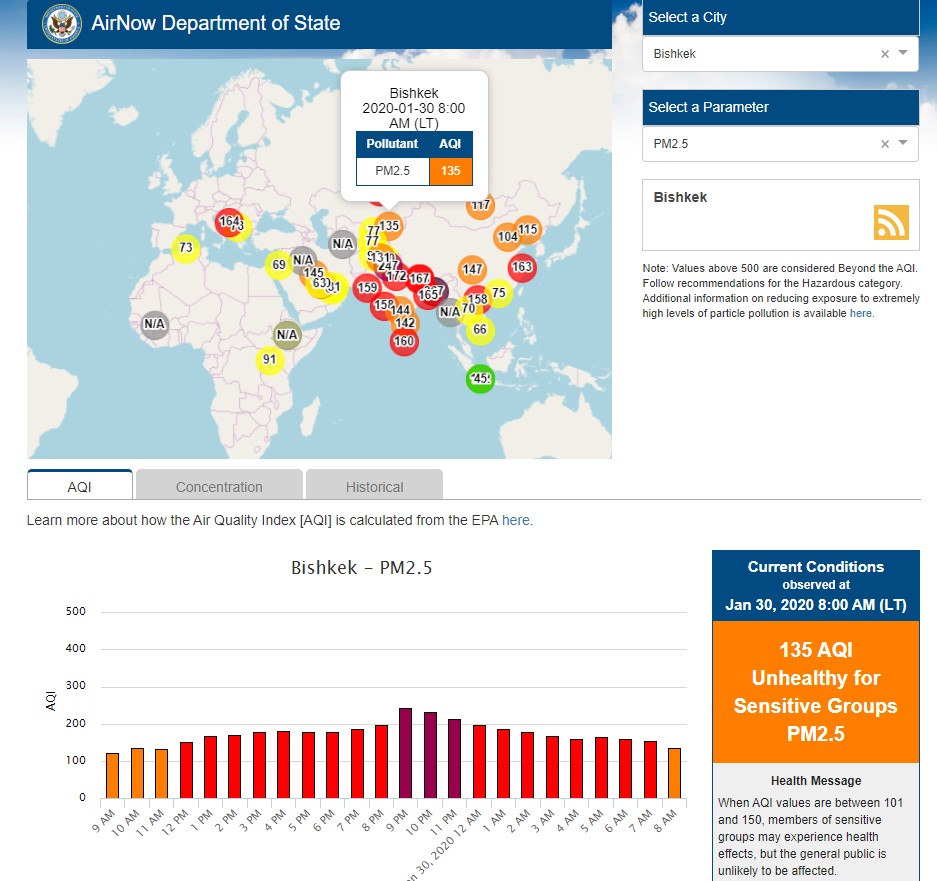 Посольство США в Кыргызстане также установило датчик. Он показывает индекс качества воздуха в режиме онлайн. Информация обновляется ежечасно.