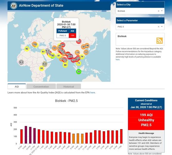 Посольство США в Кыргызстане также установило датчик. Он показывает индекс качества воздуха в режиме онлайн. Информация обновляется ежечасно.