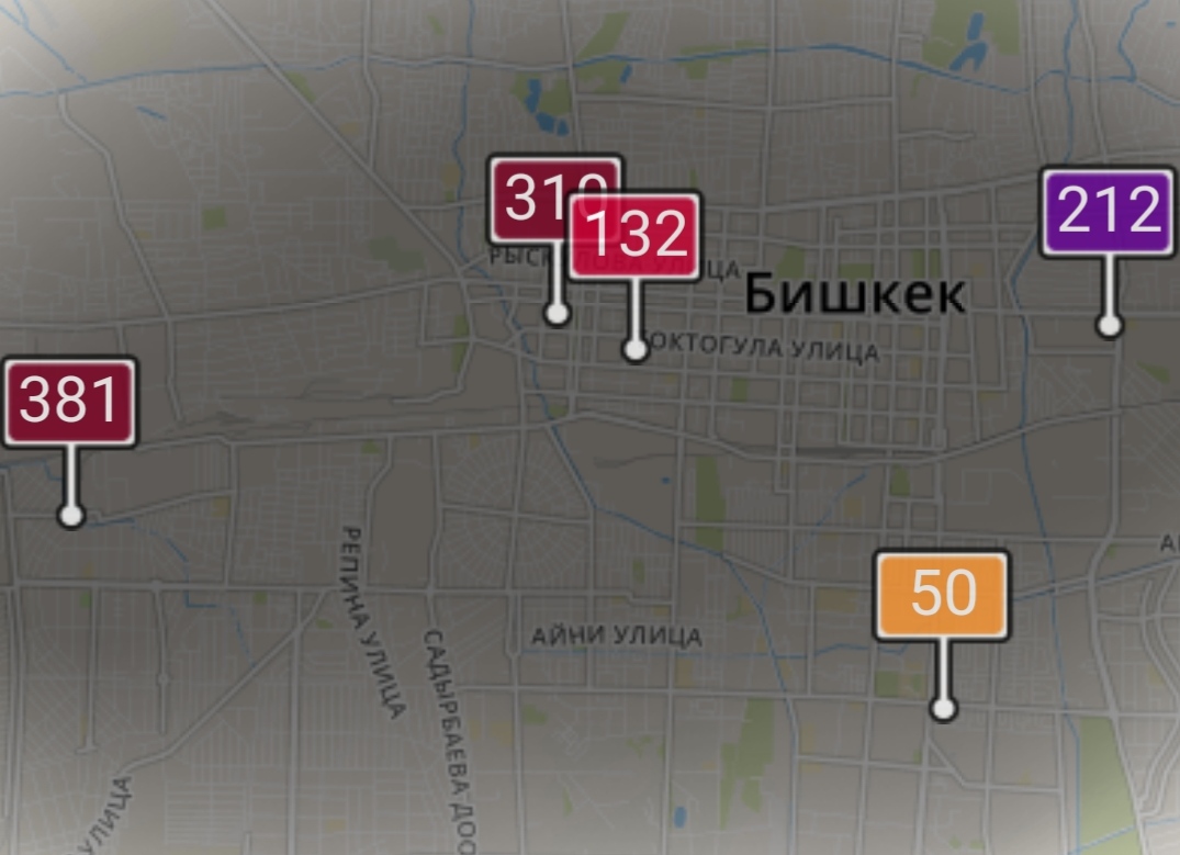 - в районе улиц Бейшеналиевой/Токтогула. Уровень загрязнения превышен в 6,22 раза: PM2.5 среднесуточный — 218 мкг/м³, на момент измерения — 310 мкг/м³;