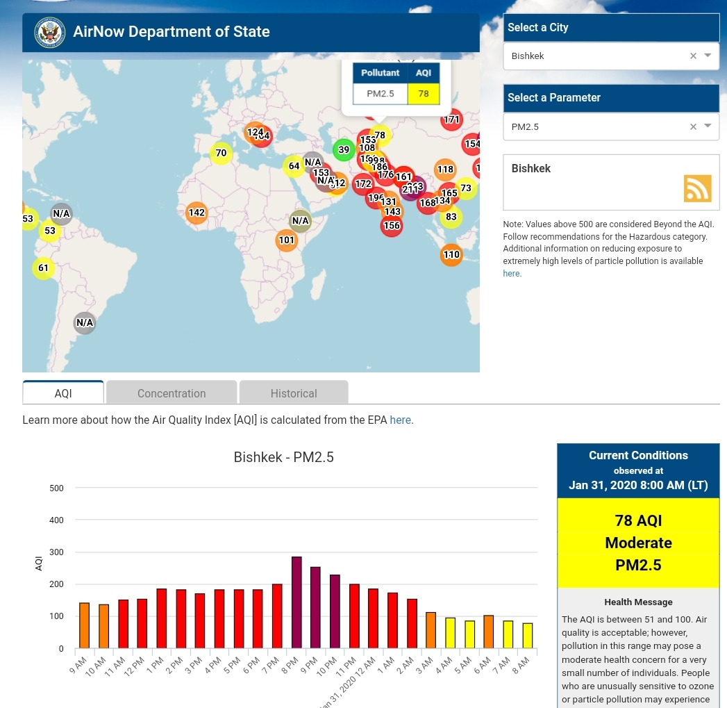 Посольство США в Кыргызстане также установило датчик. Он показывает индекс качества воздуха в режиме онлайн. Информация обновляется ежечасно.