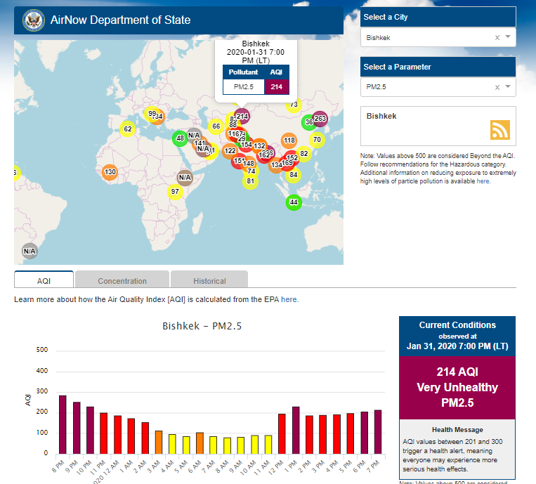 Посольство США в Кыргызстане также установило датчик. Он показывает индекс качества воздуха в режиме онлайн. Информация обновляется ежечасно.